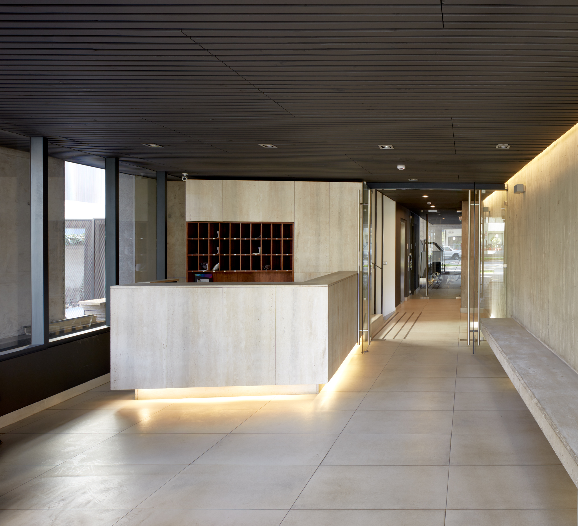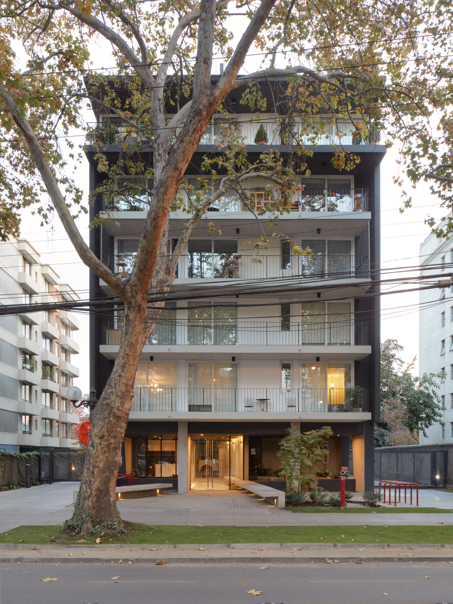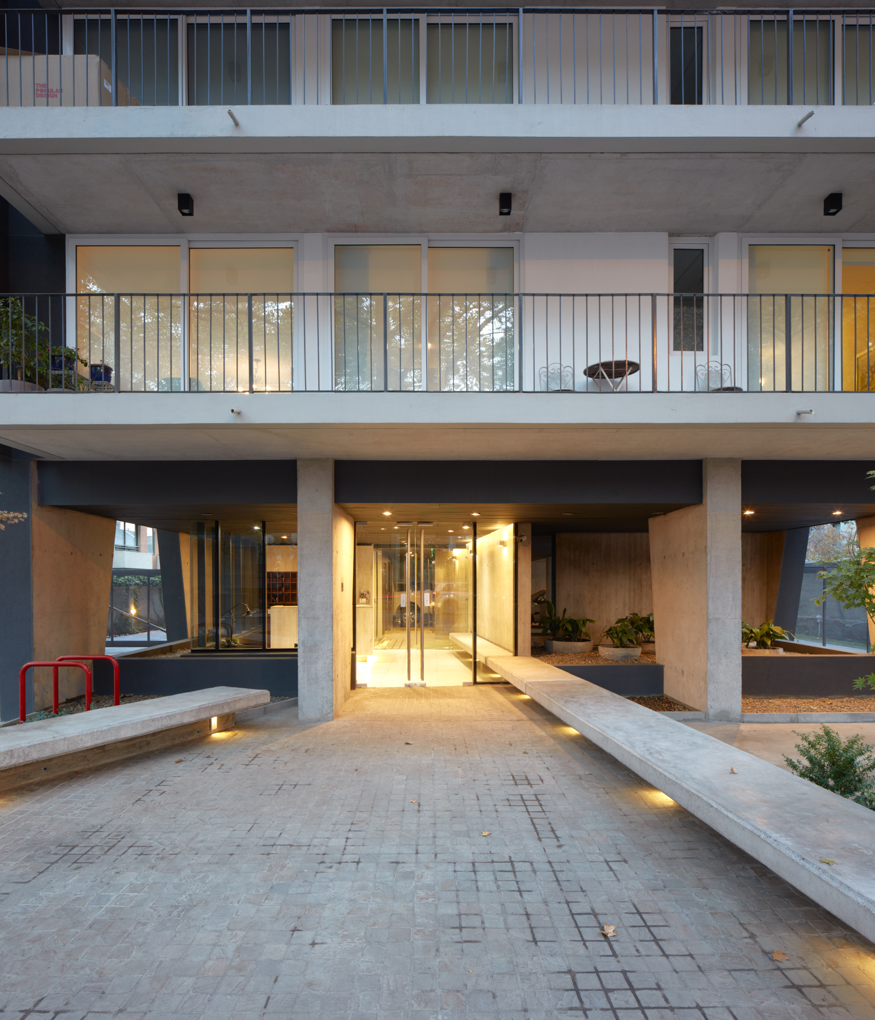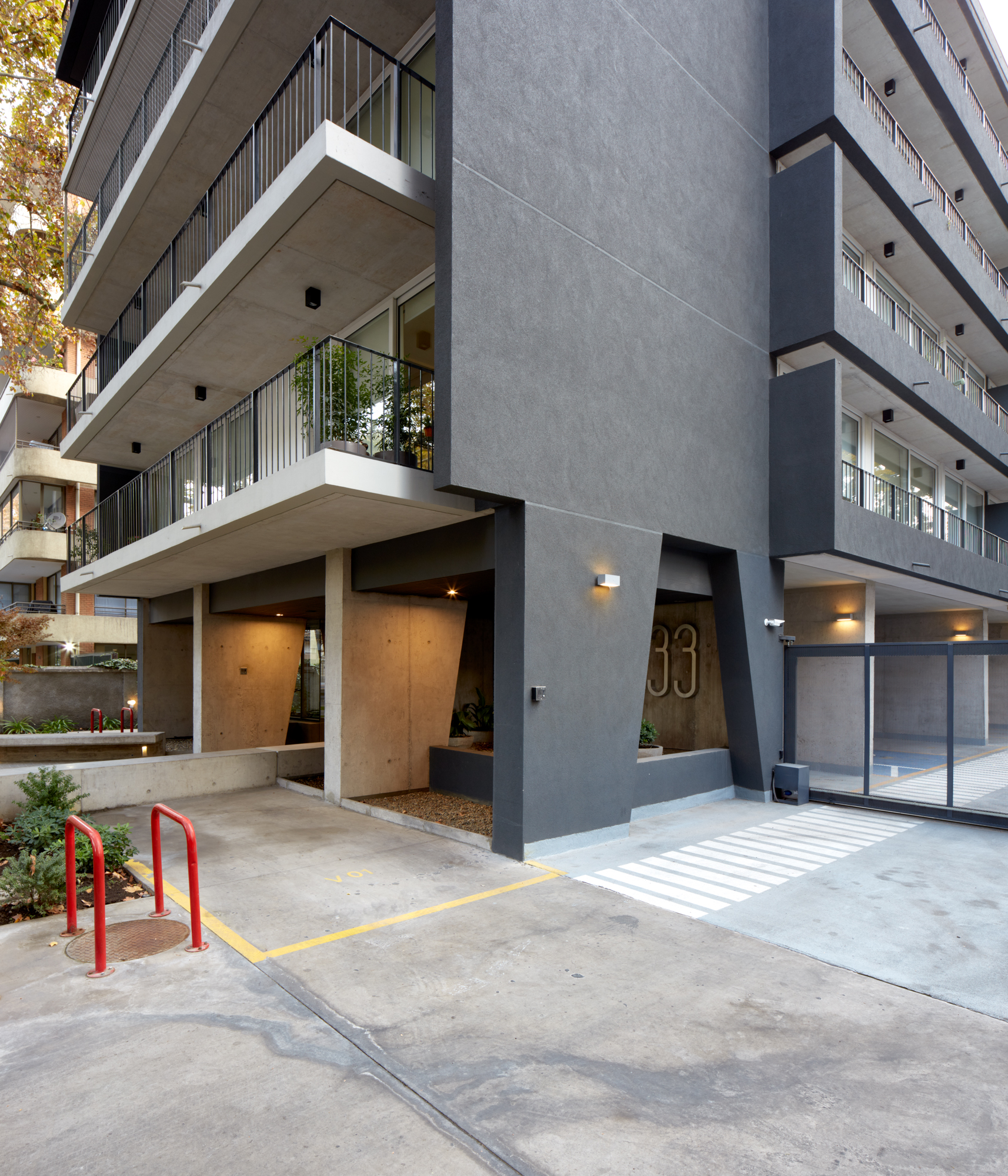 El edificio Lyon 1633 se enmarca dentro del proceso de densificación sobre la ciudad jardín que viene generándose desde los años 60 en Providencia. Sobre un único paño de 1200m2 de formato alargado con su frente angosto hacia Av. Ricardo Lyon, se plantea una densificación vertical de 32 departamentos distribuidos en 6 pisos sobre un primer piso libre de viviendas que contiene los accesos, equipamiento común y algunos estacionamientos. Este piso se plantea como una continuación del espacio público peatonal, rescatando una característica muy típica de la vivienda colectiva de los años sesenta y setenta de Providencia. Es así como mediante el mobiliario urbano y el paisajismo se genera una continuación de la vereda exterior hacia los dos núcleos interiores que llevan hacia las plantas superiores del edificio, deliberadamente optamos por prescindir de un cierro divisorio entre el espacio público y privado, proyectando sólo unos portones vehiculares que se encuentran mucho más atrás de la línea oficial del terreno para un adecuado control de acceso. De esta forma, el cuerpo regular de los pisos superiores se posa sobre pilares y dos núcleos de acceso en hormigón visto y vidrio y la división entre lo público y privado se hace difusa.