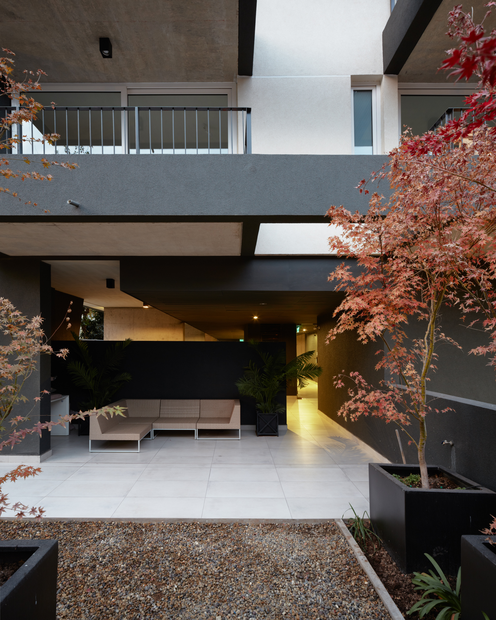 Esta división de los núcleos nace de una mezcla entre un requerimiento comercial y uno espacial. El primero consiste en la solicitud de reducir los metros cuadrados comunes para optimizar la superficie habitable, y el segundo en la búsqueda de departamentos con orientación hacia el sur y el norte mejorando las condiciones de iluminación y ventilación, con lo cual la posibilidad de un solo pasillo central longitudinal se hacía inviable. Se generan de esta forma halles de distribución pequeños e iluminados que distribuyen a solo 3 departamentos por piso, evitando de esta forma el clásico pasillo alargado y ciego que caracteriza a la arquitectura inmobiliaria desde los años 90.