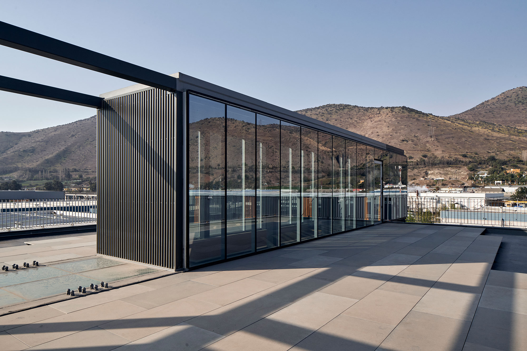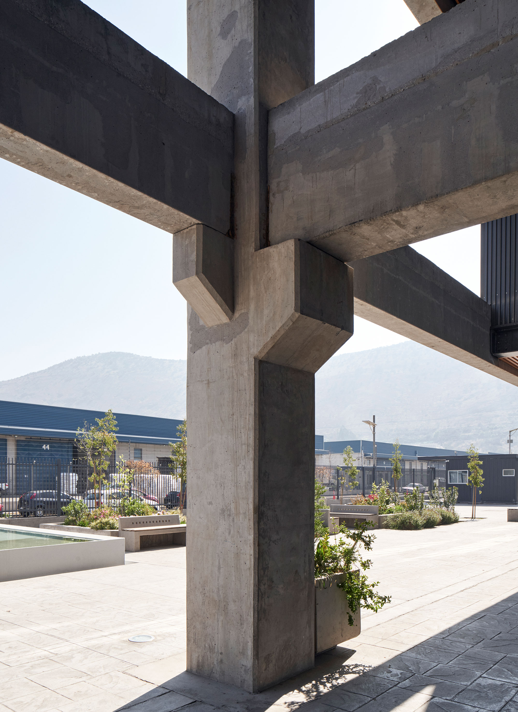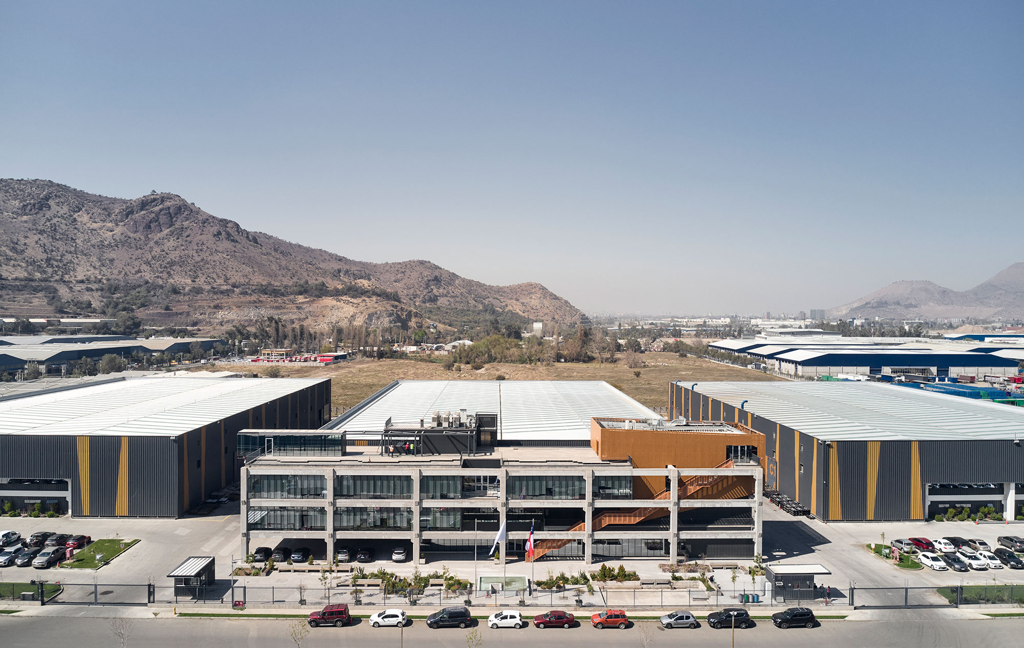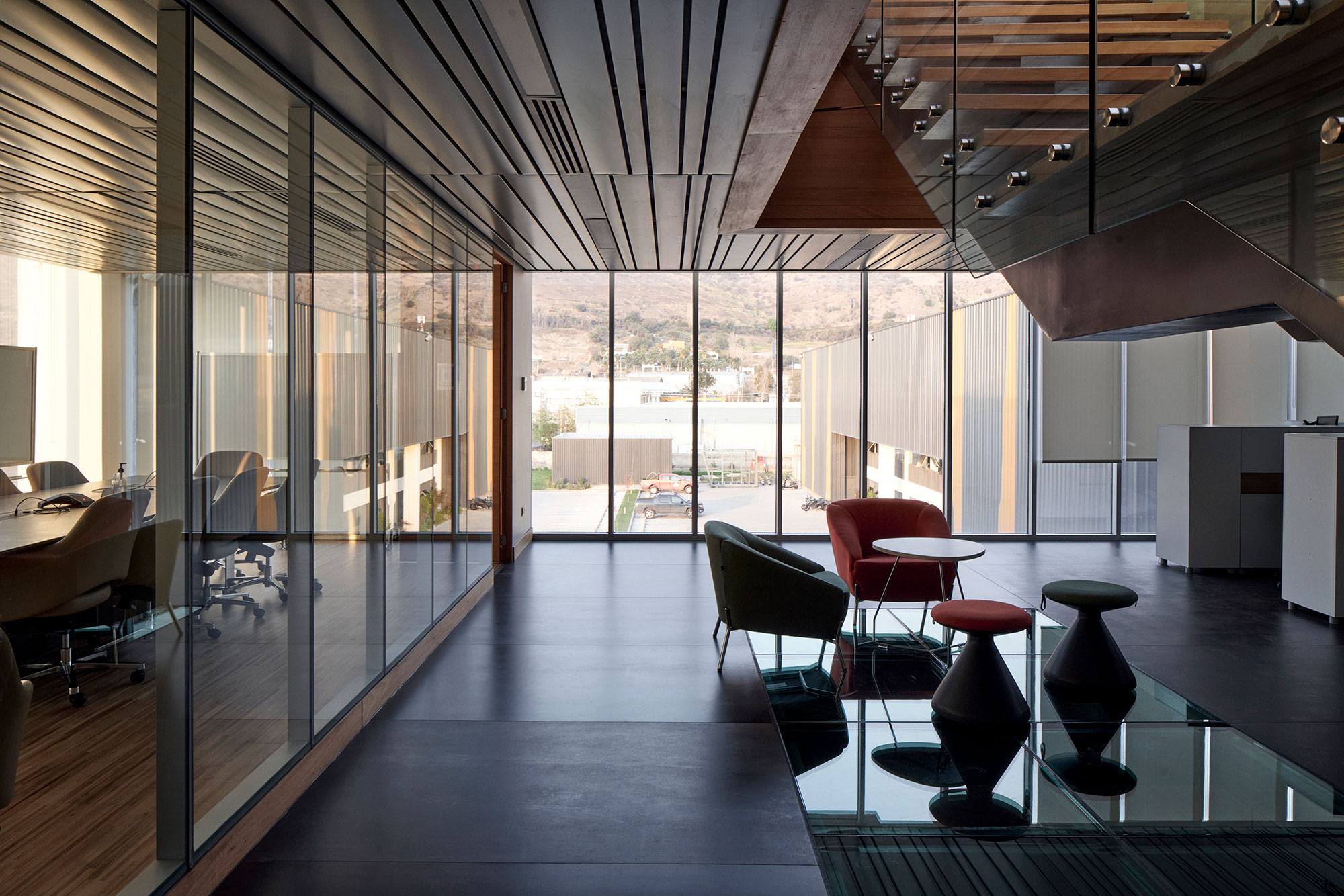La respuesta a estas tres directivas fue un complejo de tres grandes naves productivas tras un edificio central de 4 pisos de altura concebido como una grilla regular usando una estructura de pilares y vigas prefabricadas de hormigón. Esta grilla viene a ser el soporte de los distintos recintos, los cuales están dispuestos dentro de este sistema estructural y son ordenados, no sin cierta tensión, a través de este orden cartesiano. Debido a lo anterior es que optamos por respectar la plasticidad geométrica del sistema prefabricado y no revestirlo de modo de que queden expuestos los principios estructurales del sistema, así como pilares, vigas, amarres y nudos rígidos de hormigón. Los espacios intersticiales que se producen entre las diferentes partes del programa y la estructura dan pie a diversas instancias, en algunos casos resultan en terrazas exteriores, mientras que en otros se convierten en vacíos de doble y triple altura. Son estos mismos intersticios, los que generan la posibilidad futura de ampliaciones, las cuales siempre quedarán reguladas dentro de la grilla de hormigón, manteniendo la lógica original del proyecto. Vidrio, madera, acero cortén y cobre son los principales materiales usados, los que contrastan con la desnudez de la estructura de hormigón y proveen ambientes transparentes, pero acogedores a quienes acá trabajan y al mismo tiempo remiten a las materias primas del rubro minero, logrando así un edificio que relata en cierto modo la historia de esta empresa.