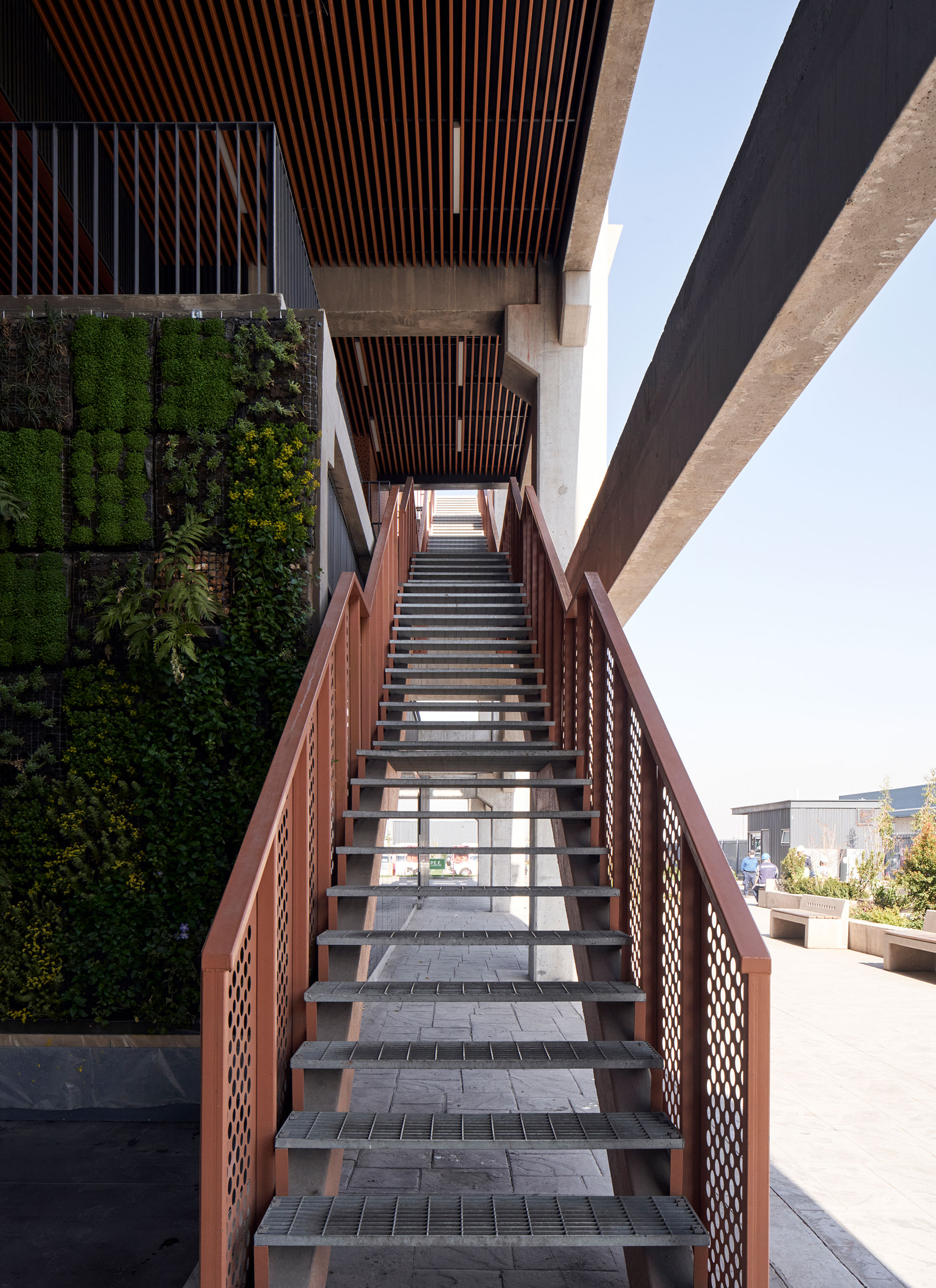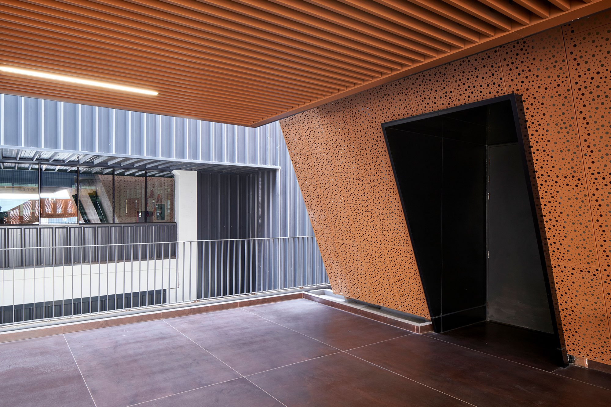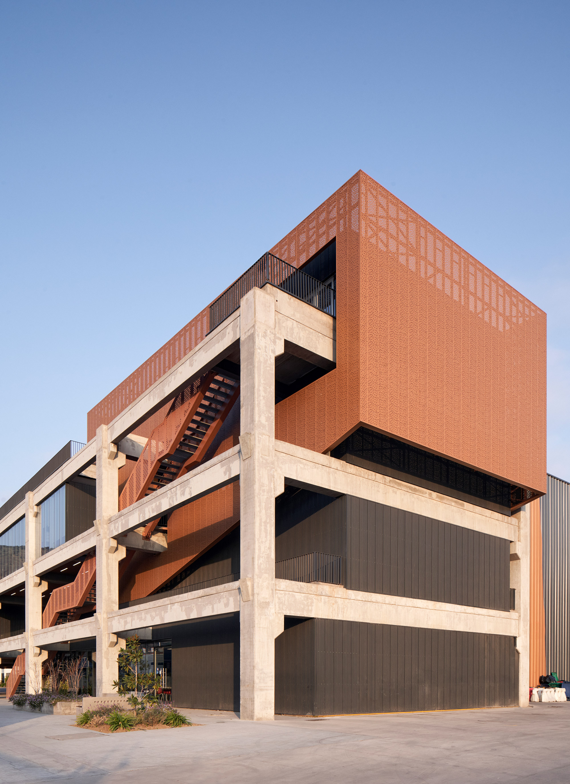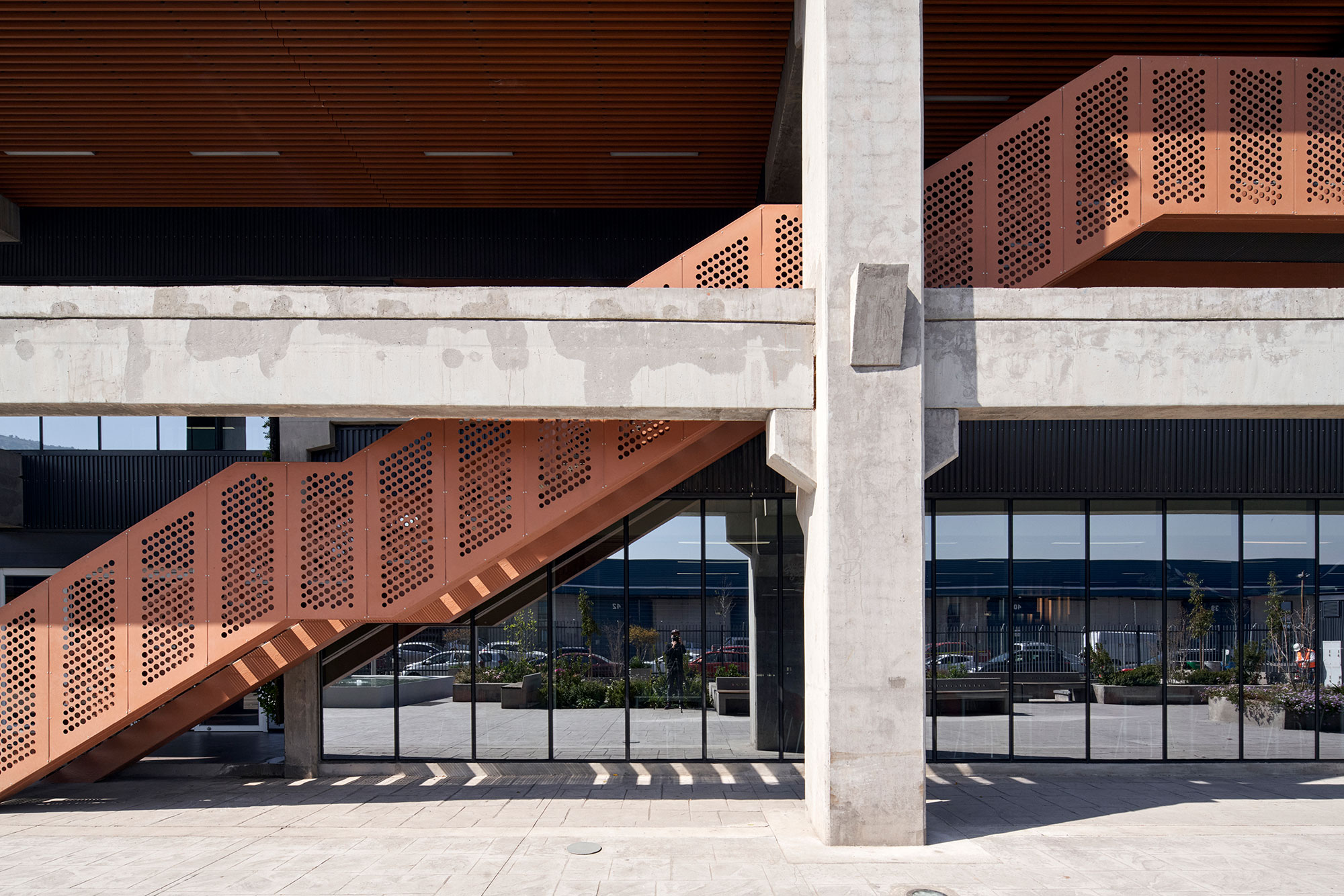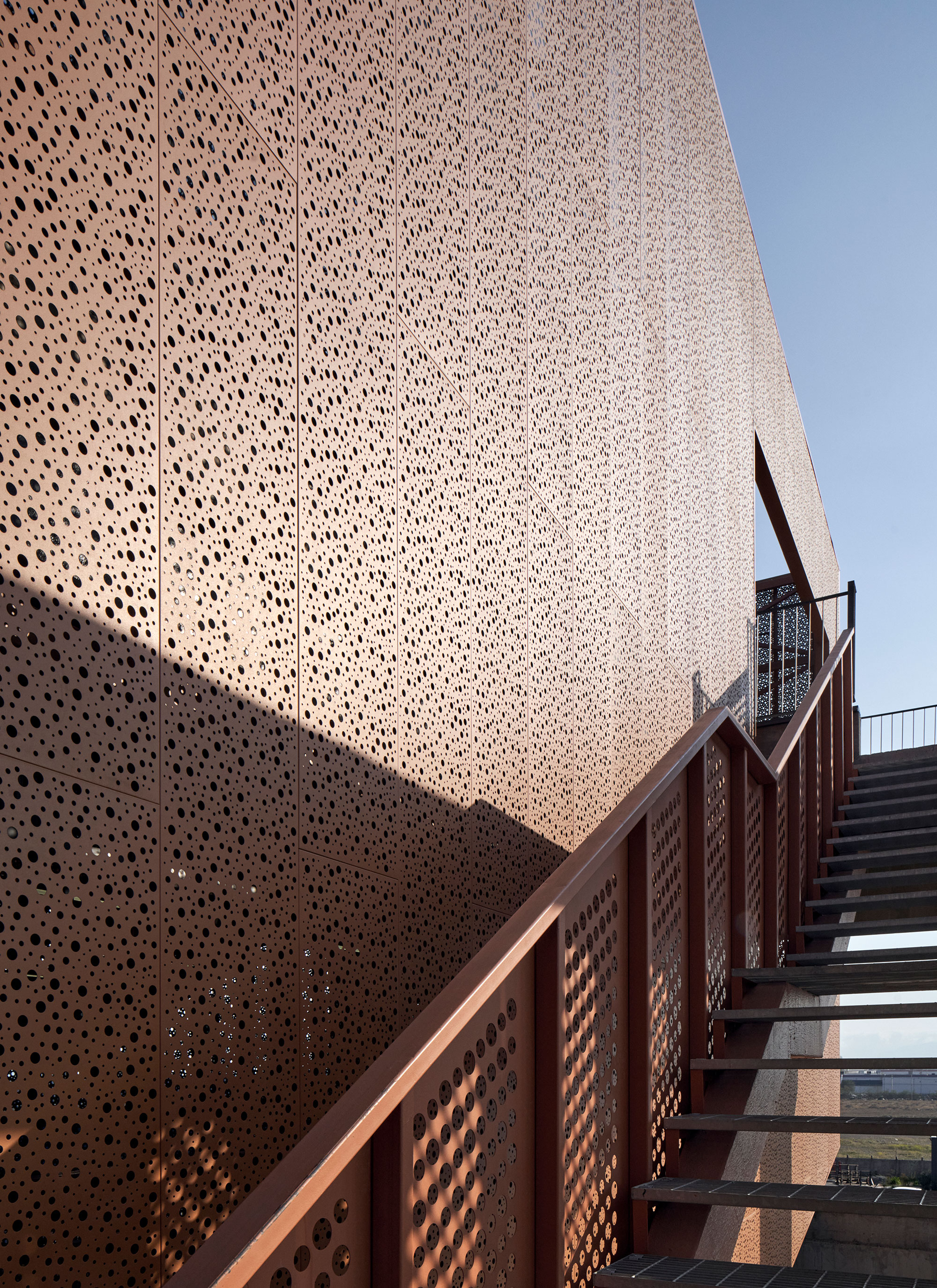 La respuesta a estas tres directivas fue un complejo de tres grandes naves productivas tras un edificio central de 4 pisos de altura concebido como una grilla regular usando una estructura de pilares y vigas prefabricadas de hormigón. Esta grilla viene a ser el soporte de los distintos recintos, los cuales están dispuestos dentro de este sistema estructural y son ordenados, no sin cierta tensión, a través de este orden cartesiano. Debido a lo anterior es que optamos por respectar la plasticidad geométrica del sistema prefabricado y no revestirlo de modo de que queden expuestos los principios estructurales del sistema, así como pilares, vigas, amarres y nudos rígidos de hormigón. Los espacios intersticiales que se producen entre las diferentes partes del programa y la estructura dan pie a diversas instancias, en algunos casos resultan en terrazas exteriores, mientras que en otros se convierten en vacíos de doble y triple altura. Son estos mismos intersticios, los que generan la posibilidad futura de ampliaciones, las cuales siempre quedarán reguladas dentro de la grilla de hormigón, manteniendo la lógica original del proyecto. Vidrio, madera, acero cortén y cobre son los principales materiales usados, los que contrastan con la desnudez de la estructura de hormigón y proveen ambientes transparentes, pero acogedores a quienes acá trabajan y al mismo tiempo remiten a las materias primas del rubro minero, logrando así un edificio que relata en cierto modo la historia de esta empresa.